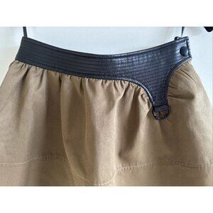 Step into elegance with this modern, edgy C + Impress brand women's skirt, a gem from Japan. Measuring 26.5 inches in length and with a waist that spans 13.5 inches across, this exquisite piece is designed for the daring yet sophisticated woman. Crafted with a beautifully lined interior and featuring an effortless side zipper with a snap closure, this skirt combines style and functionality flawlessly. The luxurious black vegan leather at the waist contrasts beautifully with the rich golden brown fabric, making it a perfect statement for both spring and winter. Constructed from a stiffer, solid material, this skirt embodies a sophisticated charm that will turn heads wherever you go. Don’t let this chance slip away to embrace a piece that seamlessly blends comfort with contemporary flair—add this alluring skirt to your collection today!