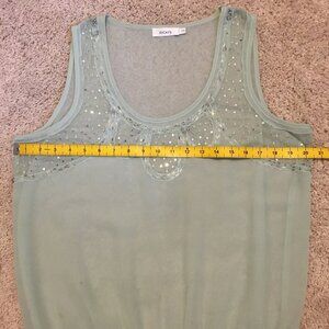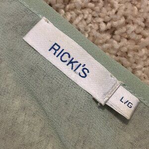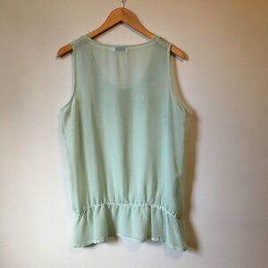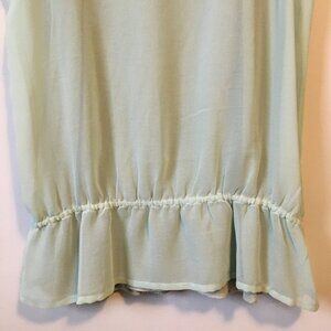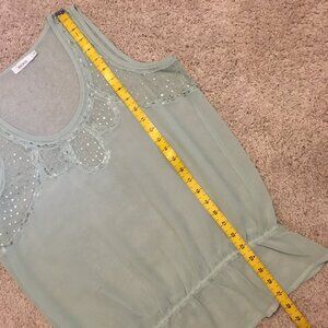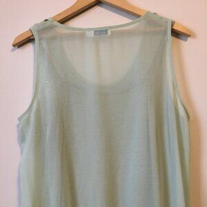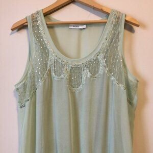 Very good preowned condition, flowing, chiffon fabric, sleeveless, sheer, seafoam green tank top by Ricki's. The finishing touch to your mermaidcore ensemble. Beautiful sequin and bead embroidered details and lace below the front collar. Elasticized waist. I also have unlisted camisoles in a similar colour. I have included a few photos with the cami. Please inquire if interested.