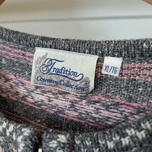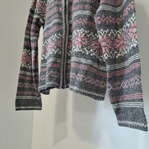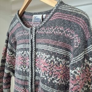 Sears |Vintage Pink, grey & white with front sequins zip up womans sweater snowflake Christmas pattern. Brand tradition country collection. woman's size X large.
