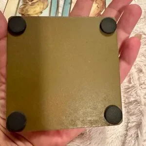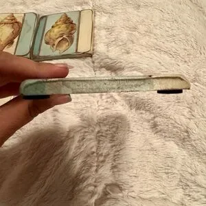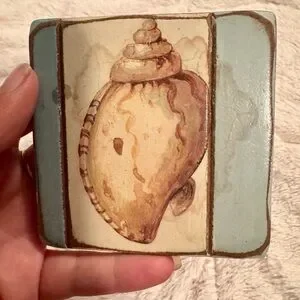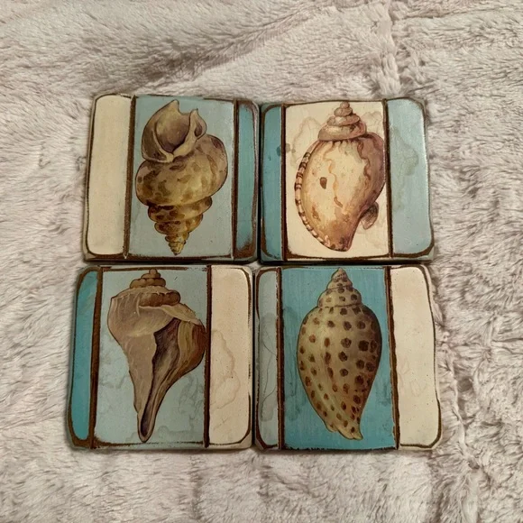 Set of 4 coasters with seashell illustrations. Ideal for coastal decor. Features blue and cream colors.