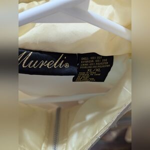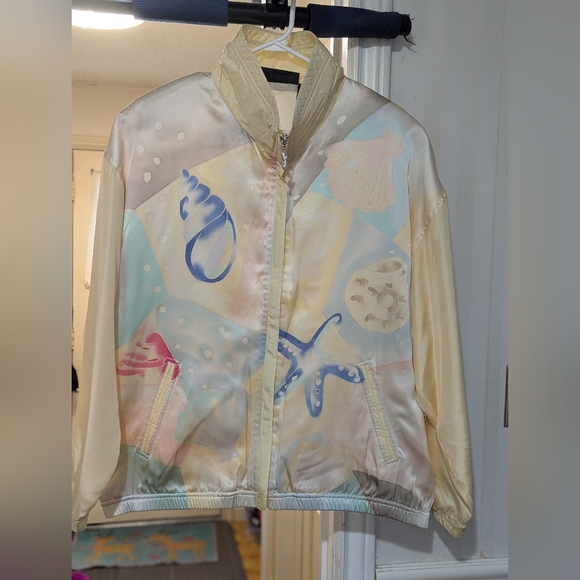 Stylish jacket with a seashell pattern. Features pastel colors and a zip-up front.