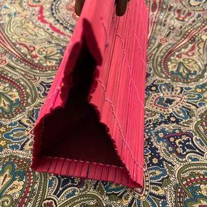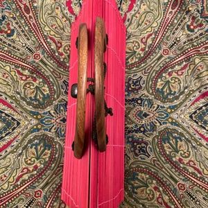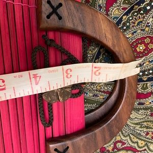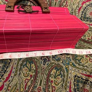 Purchased in a boutique in Seattle: red wood purse with cloth lining/sides and wood handle. Super cute and unique, I only used it twice on special outings. Time for it to find a worthy home!