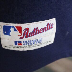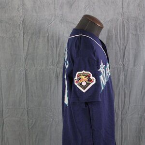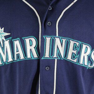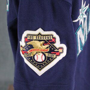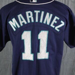 Up for sale is a vintage Seattle Mariners jersey by Russell Athletic. It has a blue base colour with silver trim. The front of the jersey has the Mariners logo crested on. One sleeve has 2001 All-Star Game logo crested and the other sleeve has the AL 100 years logo crested on. The back of the jersey has Martinez and the number 11 crested on. What a great jersey, do not miss out on it.