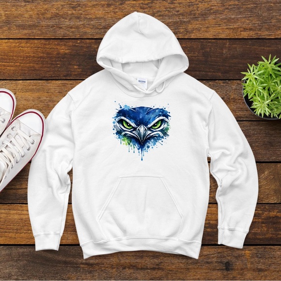 White hoodie with a bold Seahawks design. Ideal for casual outings or the Super Bowl