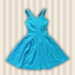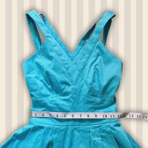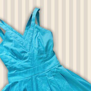 Brand new with tags, vibrant sky blue, cross-strap front, dramatic bow tie-back, and a flattering fit-and-flare silhouette.