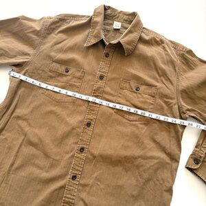 Secondhand tan button down long sleeve shirt. There is a hole in the side of the shirt.