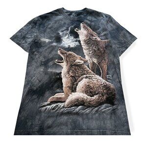 Secondhand tie dye style t-shirt, featuring two howling wolves or coyotes.