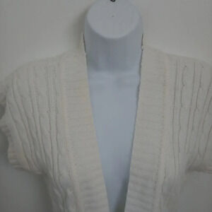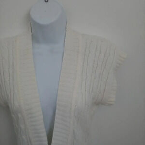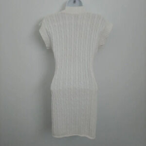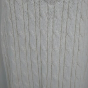 Classic cream coloured cable knit dress with very deep vee neckline. Shirt sleeves, nearly capped sleeves. Tailored cut for a flattering fit.