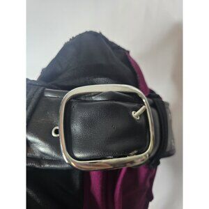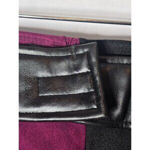 The faux leather belt has some chips in the material and markings. There is some minor sticky residue on the back closure of the belt.