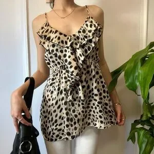 This leopard print ruffled tank top is a stylish and versatile piece that can be worn in various setting and can easily be dressed up or down with accessories. ✨ The tank top can be paired with jeans, shorts, or skirts for a casual look, or dressed up with a statement necklace and heels for a more formal occasion. ✨ Size medium but fits small as well - the waistband is stretchy! ☺️