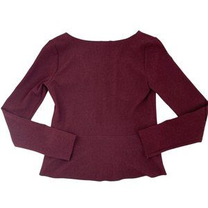 Elegant deep red blouse with textured fabric. Features a flattering V-neckline and long sleeves. Perfect for any occasion.