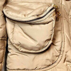 This tan puffer jacket by See By Chloe combines style and functionality with its quilted texture and wide collar. The smooth, water-resistant material ensures comfort and protection against the elements, while the slightly fitted silhouette offers a flattering fit. Perfect for adding a touch of elegance to your outerwear collection.