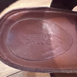 In very good condition. See By Chloe black leather sandals. Step out in style with these chic black leather strappy sandals. Perfect for any occasion, they offer both comfort and elegance. Featuring an almond toe, block heels, adjustable ankle straps, and tonal stitching. 3" heel and rubber soles.