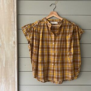 Add a pop of color to your wardrobe with this breezy, vintage-inspired blouse from See U Soon. Made from 100% cotton, it features a bold golden yellow and brown gingham check pattern with fluttery cap sleeves and gathered detailing at the shoulders and back. The relaxed, boxy fit and lightweight fabric make it perfect for summer layering.
