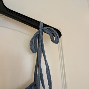 Chic blue maxi dress with tie straps. Perfect for casual outings. Comfortable and stylish.