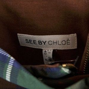 This mini skirt from See by Chloé's 2009 Autumn and Winter collection is made with a synthetic taffeta in a green and brown plaid print, and features a front zip closure, an olive green acetate buckle, front slanted pockets, an asymmetrical faux front wrap, and is lined in a brown lightweight cotton.