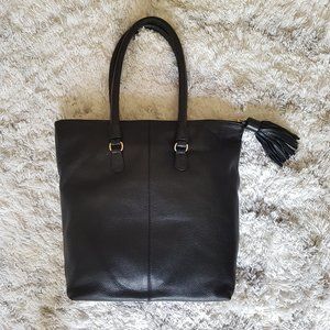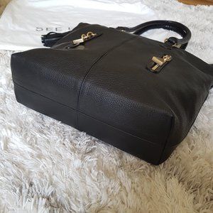 See by Chloe black leather tote. Well made, exceptional quality. This bag has one large compartment with smaller internal pockets, plus two external zipper pockets on the front. Secure zipper closure at the top with a large leather tassel. Great for the office, travel, or errands around town - very roomy and functional.