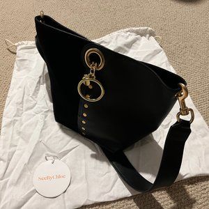 Open top with chain link bar and loop fastening. Metal stud accents.