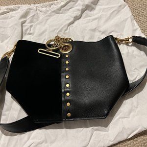 Leather and suede exterior with leather lining with antique gold-tone hardware