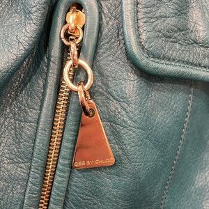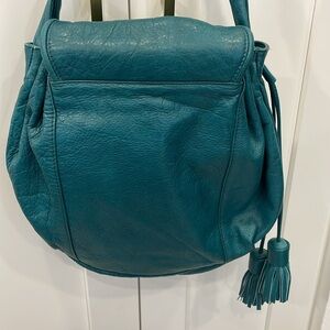 See by Chloe Cherry crossbody bag in teal soft leather with gold toned hardware, two vertical front pockets, drawstring with tassel ends, snap button flap closure, long crossbody strap (not removable or adjustable), fabric lined interior with smaller pockets inside. Made in Morocco. Good pre owned condition with a small scratch on the back, light scratches to hardware. Please see photos, measurements are for reference only. Reasonable offers welcome!