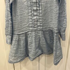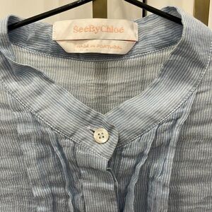 See by Chloe drop waist blue and white pin striped dress with ruffled cotton blend ( material is thin/ see through)Banded collar, shirred long sleeve and drop waist, front button closure with ruffled placket and flared skirt. Made in Portugal. Size 42/ US10. Good pre owned condition. A few light marks/fading on the front left of the dress (photos 14 & 16) Left sleeve cuff button has broken in half (photos) but can be replaced with the spare button on care tag, the sleeve can still close with the broken button. Please see photos, measurements are for reference only. Reasonable offers welcome!
