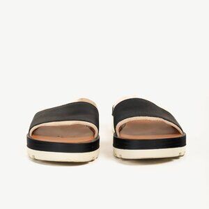 The Robin sandals from See by Chloe are crafted in a black leather, and feature low platform wedge heels, open rounded toes, dusty rose suede trim on the straps, wooden black midsoles, and white lug outsoles.