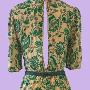 See U Soon green floral short sleeve dress with pockets and lateral zipper, size S. Beautiful and light. Material: shell and lining 100% viscose. Measurements: waist 15 in, chest 18 in, length 40 in, shoulders 15 in. New with tag.