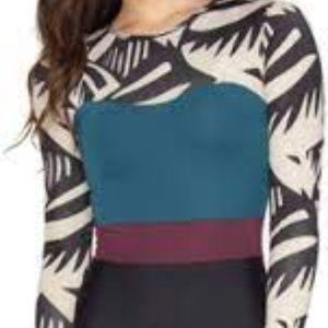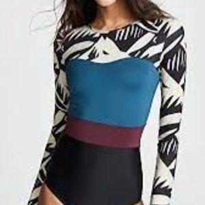 Seea Hermosa Swimsuit Buzios Multi Colorblock design Long sleeves Shell: 80% nylon/20% spandex Lined Lining: 80% polyester/20% spandex.