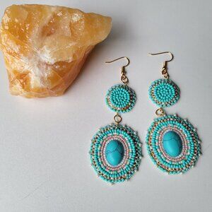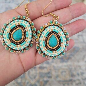 Beautiful handmade Seed Bead Earrings. 14k Gold plated findings. Ethically sourced deer hide backing. Czech Seed beeds: delicas, precocia. Very very light weight.