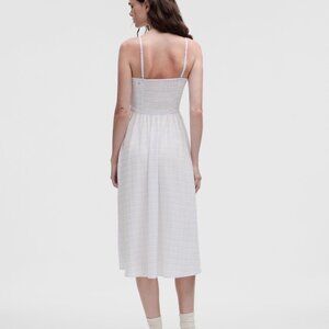 Twirl power. This versatile midi dress has a swishy A-line skirt, plus a smocked back for comfort. Removable straps add support and styling options. Color is Blister Check Butter Cream Lavender Frost. Size S.