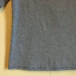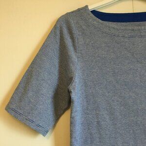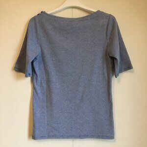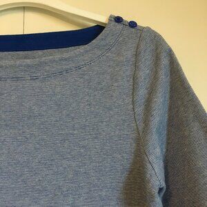 Very good preowned condition blue and white horizontal pinstriped, half sleeve/3/4 sleeve, boat neck tee with cute blue button accents at one shoulder by Segments. Super cute and great condition. Quite a bit of stretch.