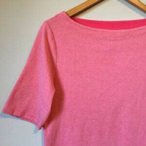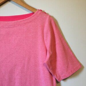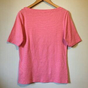 Very good preowned condition pink and white horizontal pinstriped, half sleeve/3/4 sleeve, boat neck tee with cute blue button accents at one shoulder by Segments. Also selling a blue one in small. Quite a bit of stretch.