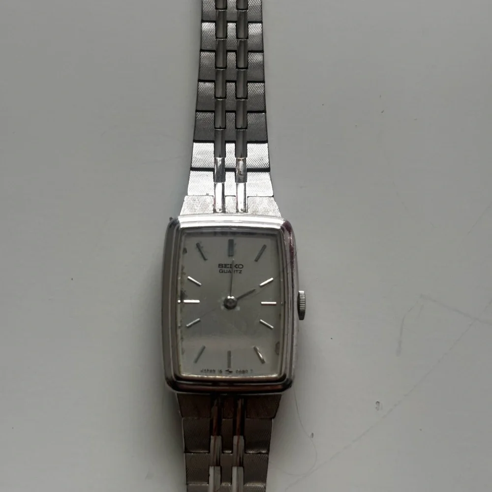 Beautiful vintage Seiko Quartz watch with a timeless rectangular face and stainless steel bracelet. Elegant, minimalist design that works perfectly for everyday wear or as a dress watch.