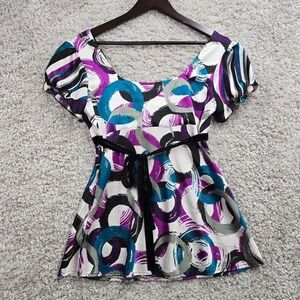 Sele Babydoll Top Womens Medium Colorful Satin Short Sleeve Tie Y2K