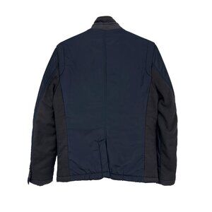 Modern mixed-media blazer by SELECTED (Homme) in a deep navy with charcoal panels. Lightly padded nylon body with woven contrast sides/sleeves, knit stand collar insert, two-button front, flap waist pockets, chest patch pocket with built-in printed “pocket square,” three-button cuffs, and a bold city-print lining. Style name on care tag: Happer Padding Jacket