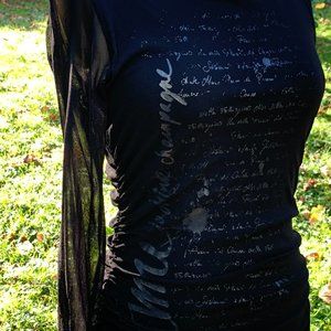 There is silver writing on the front under-layer, which shines through the top transparent fabric - See last 2 photos