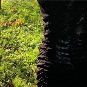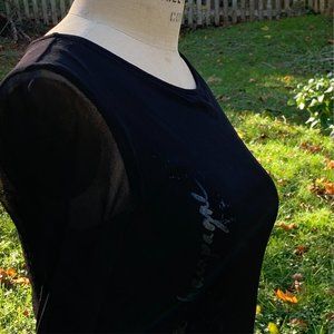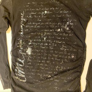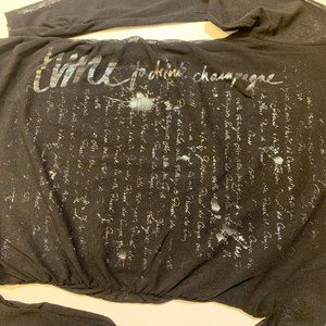 The only words that really are distinguishable at a glance are "Time to drink champagne", and since these run vertically up the right side of the front, they make for quizzical looks and lots of guessing. In other words, this top is a lovely conversation piece