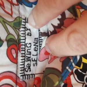 17.5" waist lying flat and 23.5" waist to hem approximately. No size tags, but feels like cotton. Vibrant flowered pattern, thick elastic waist, lined.