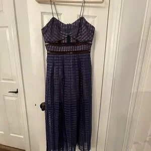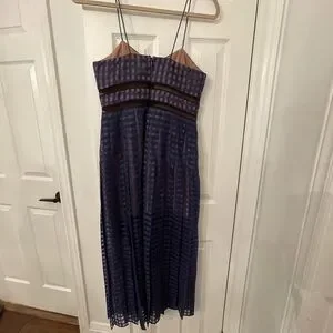 Stylish navy dress with a checkered pattern. Features a sheer overlay and elegant design. Size UK 12 US 8