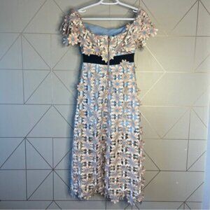 Self-Portrait 3D Floral Guipure Lace Off-Shoulder Midi Dress Pink Blue in very excellent pre worn condition. Like new. This dress exudes nothing but grace and poise with its flawlessly feminine silhouette. It is fashioned in blue-pink floral Guipure lace, which is enhanced with an off-shoulder style and belt detail. Please see all photos.