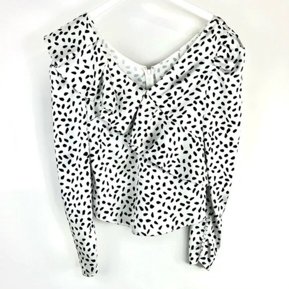 This romantic blouse from Self-Portrait’s 2020 Spring and Summer collection is made in an Ivory satin with a Black dot pattern printed allover, and features long sleeves with buttoned cuffs, dramatic puff shoulders, a double V-neck, ruffling along the front and back, a curved hem, and an invisible back zip closure.