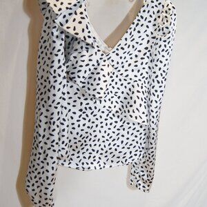Stunning Self-Portrait long sleeve top in a chic white base with black dalmatian-inspired scattered dot print. This sophisticated piece features a flattering V-neckline and the brand's signature contemporary tailoring. The abstract dot pattern adds a modern, artistic touch while maintaining an elegant silhouette perfect for both casual and dressy occasions.