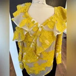 Elegant yellow lace top. Features ruffle details and button accents. Perfect for a chic look. In new condition.