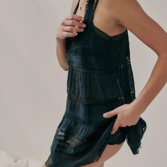 So us in so many ways, this billowy mini slip from Intimately features tiers of lace trim with ruching at the bust for a flattering accent.