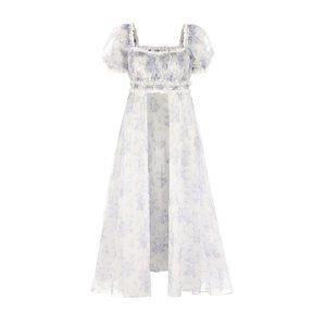 Authentic Selkie Bed & Breakfast Boudoir Dress from the Summer 2023 collection. Sheer antique porcelain print empire waist negligee with ruched milkmaid bust.