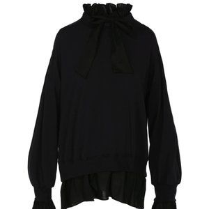 Authentic Selkie black loose fit sweatshirt with ruffled collar and sleeve cuffs. Has ties at the neck to form a bow. Soft material in a versatile colour.