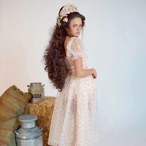 Authentic Selkie La Fraise Boudoir Dress. Sheer strawberry print empire waist negligee with ruched milkmaid bust. Open front design with midi-length skirt. Pullover style crop top bralette with elastic seams and midi train.