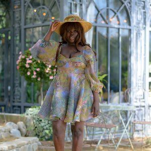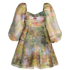 Authentic Selkie Monet Bridge Princess Dress from the Giverny collection. Long sleeve skater dress in green and purple printed organza with artwork by Monet. Dress bodice has cup detailing and a high waist. Skirt has multiple layers of organza lining for volume and a purple cotton inner lining. Save on duties and import taxes!