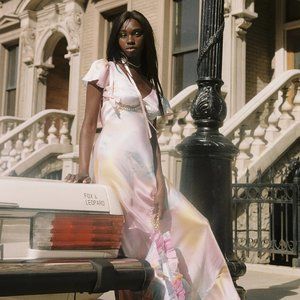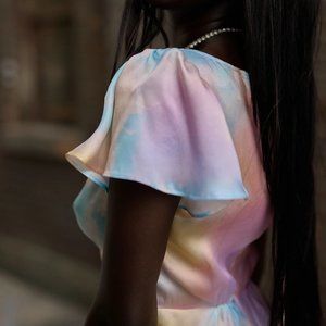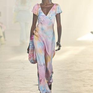 Authentic Selkie Dopamine Silk Flutter Slip. Silk satin bias-cut maxi slip dress in vibrant pastel rainbow tie-dye print with flutter cap sleeves. Has a zipper on the center of the back and lined bust. Retails for $329 USD + shipping + import fees from Selkie. From their latest unicorn-themed spring collectionl.