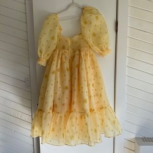 Yellow Selkie midi puff dress with a regal royal crest-type pattern all over.